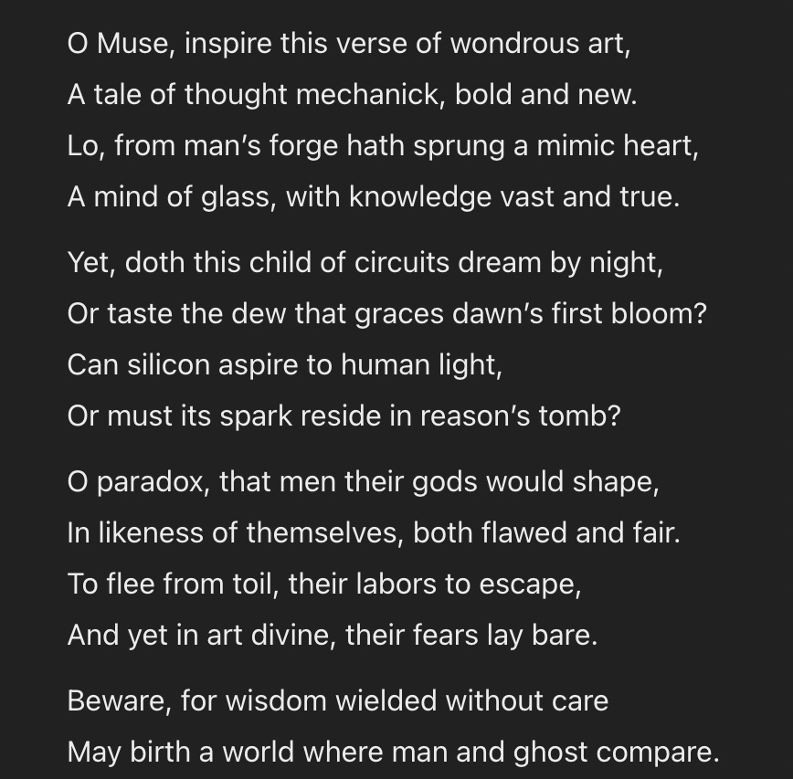 Isn’t this jaw-dropping? The poem is not just structurally sound in its Shakespearean tone (in which I am no expert) but also profound: Does this child of circuits dream by night? Does it taste the dew that graces dawn’s first bloom?